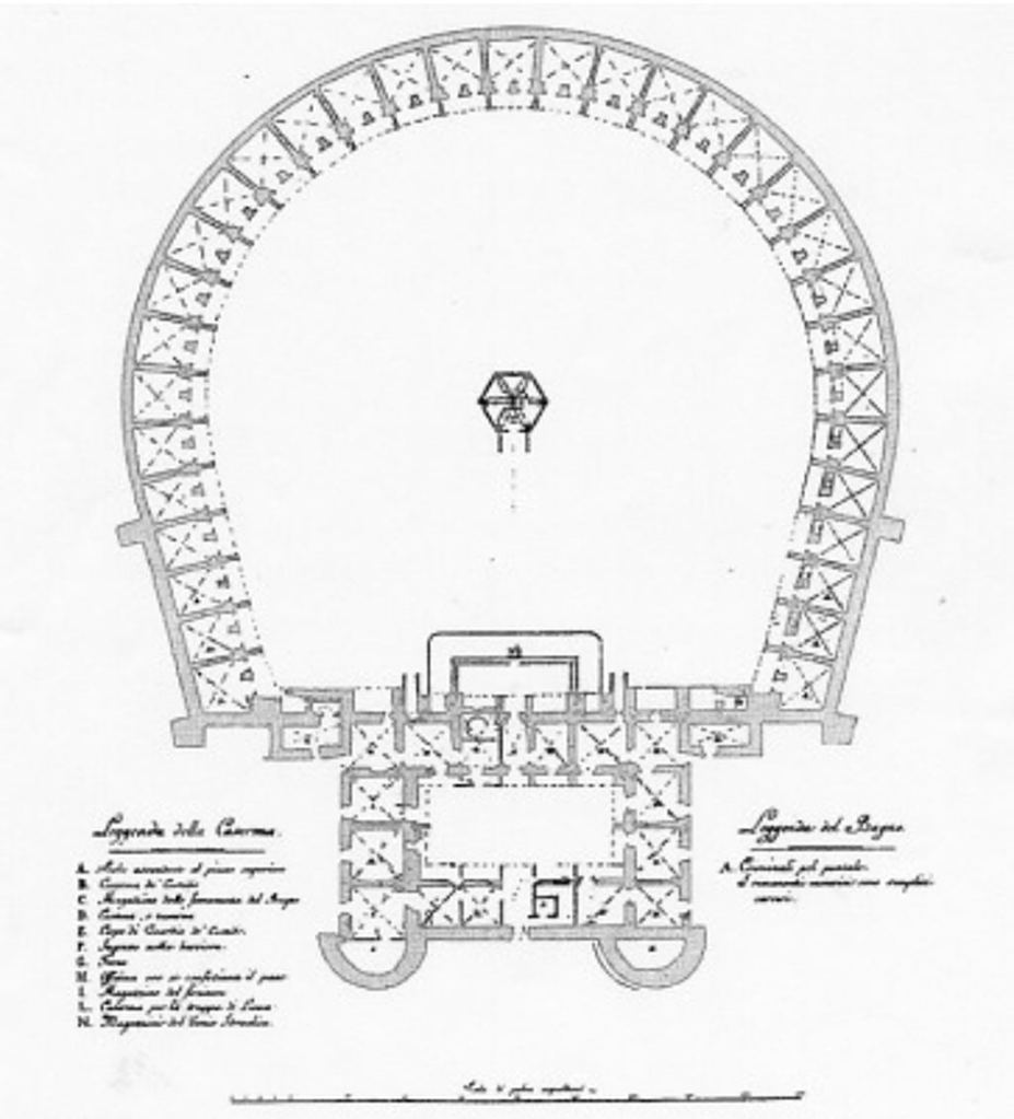I ballatoi di accesso alle celle si aprivano sul cortile con una serie di arcate sovrapposte; simili alle tribune di un teatro che si affacciano sulla platea e sul palcoscenico, la pianta del carcere era la copia del Teatro San Carlo di Napoli, attivo dal 1737. Qui, però, il rapporto tra attore e spettatore tipico del teatro era capovolto: non erano gli spettatori nelle tribune ad osservare la scena, ma dal palcoscenico (la torretta), un unico personaggio (il guardiano) osservava e vigilava i detenuti racchiusi nelle tribune.