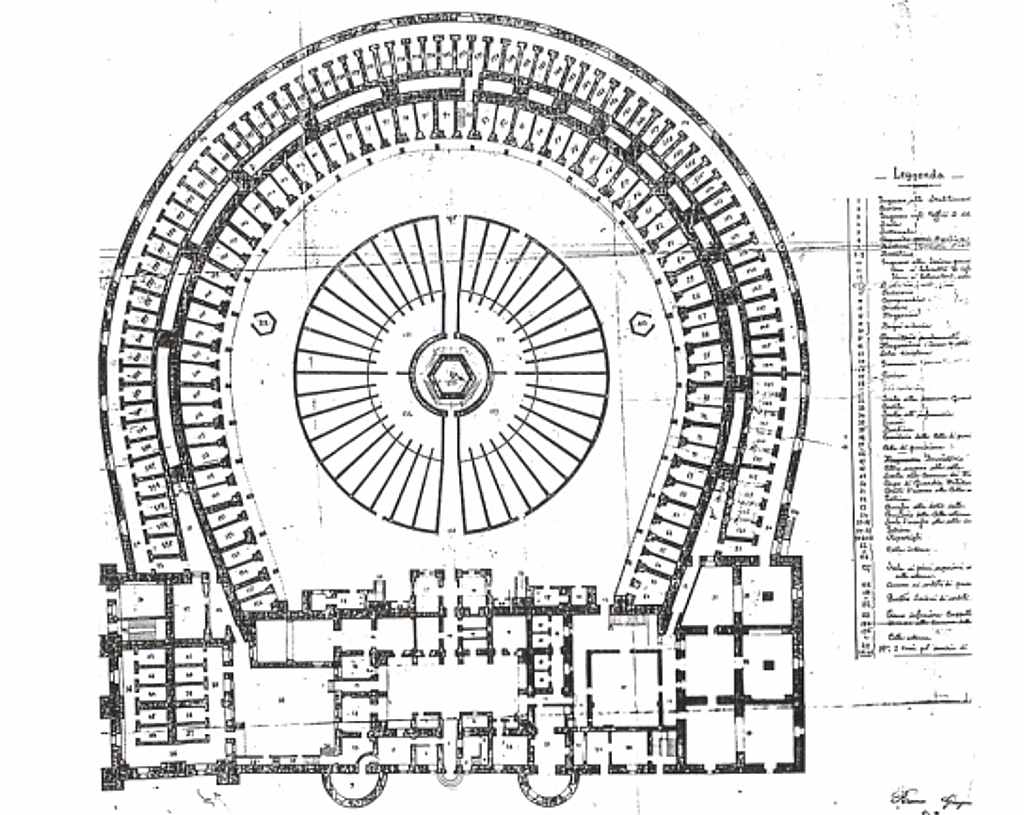 - una nuova sezione circolare a piano terra, chiamata “IV sezione speciale”, costruita esternamente alla parete perimetrale, composta da un corridoio semicircolare e 78 celle destinate ai detenuti considerati “scomodi”. Le celle, senza finestre, erano illuminate indirettamente dai finestroni che si aprivano sulla parete esterna del corridoio;