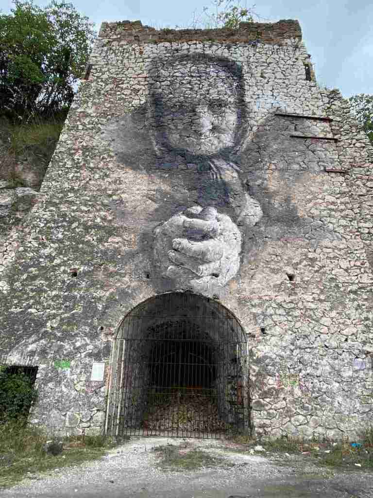 Ecco quindi che nel settembre del 2016, grazie alla bravura e alla sensibilità dell’artista Luis Gomez, sulla parete in pietra rustica dell’Altoforno della ex cava CIDI, che si affaccia sulla strada provinciale, spunta il volto di Teodora, una delle tante Facce di pietra, fotografate trent’anni prima da Romolo Belvedere. Il ritratto di un’anziana signora di Marcellina, Teodora Fornari, che per tanti anni ha lavorato nella cava CIDI, dipinto sull’Altoforno, dona nuovamente vita a questo luogo abbandonato e dimenticato da decenni. Con il volto segnato dal sacrificio del lavoro in miniera e con le mani incrociate sopra l’accesso dell’Altoforno, Teodora sembra sorvegliare la cava dove ormai non si estraggono più pietre ma pepite d’oro.